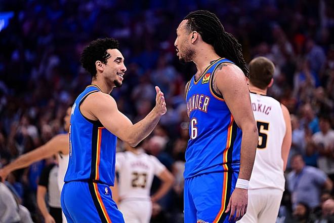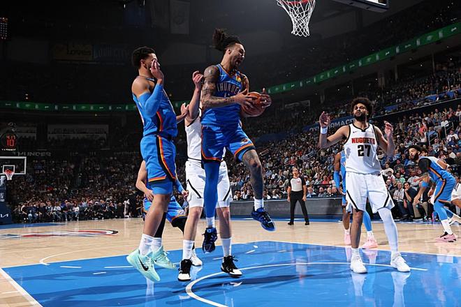 本场比赛中,雷霆的先发中锋杰林-威廉姆斯(Jaylin Williams)的表现算得上是令人刮目相看。威廉姆斯全场出场39分37秒,投篮17中10,三分线外11中7,罚球4中2,得到了29分12篮板3助攻2盖帽的两双数据,还有1次失误和4次犯规,正负值为+4。值得一提的是,29分是威廉姆斯职业生涯的第二高得分,本场比赛也是他职业生涯表现最好的比赛之一了。威廉姆斯在进攻端不断通过外线投篮完成得分,他的投射能力有了充分地体现,他还具备一定的传球能力和策应能力。到了防守端,威廉姆斯也具备一定的内线防守能力和篮板保护能力。总体来看,面对着尼科拉-约基奇(Nikola Jokic),威廉姆斯能够打出这样的表现,能够在进攻端完爆对手,也是一件很不容易的事情,也能够说明他的能力和状态有多出色。