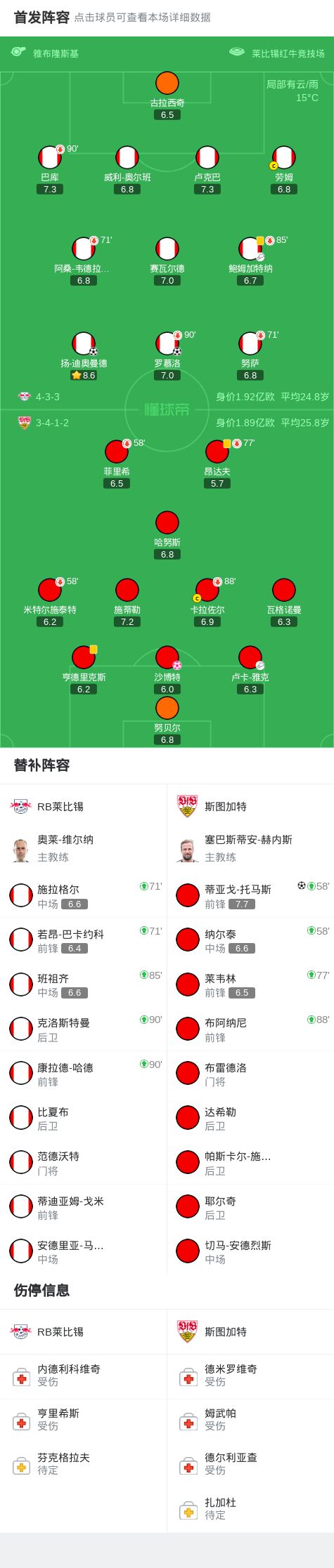 第45分钟,沙博特门前自摆乌龙,莱比锡1-0斯图加特
